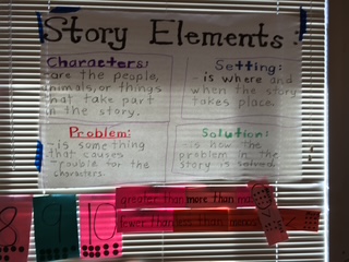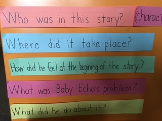 Story Elements(ストーリーエレメント):物語の構成について教師は、カーペットに座っている⽣徒達に絵本を読んだ後、質問をしながら、もう⼀度物 語について話し合います。全体をStory Elements(物語の構成)と題して、今読んだ絵 本を分析します。