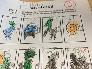 それから、机に戻り今習った単語の⼀番初めの単語の練習です。 Dの⾳を出して読みながらクレヨンでなぞっていきます。 このように、読んだ物語に出てくる単語を習っていきます。