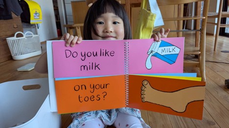 例えば、Do you like custard?と上のページにあります。そこで、on your headと組み合わせたりします。その組み合わせが奇抜なので、子供達は笑いながら、英語を学べます。